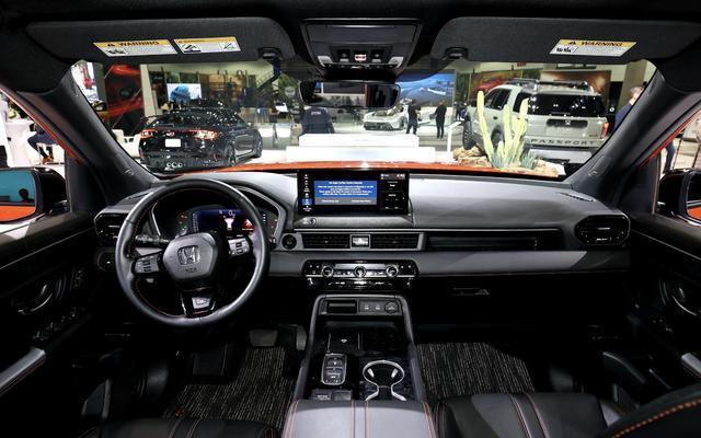 至于内饰,相对来说就比较中规中矩了。毕竟在海外这类越野车的功能还是非常单纯的,并没有像国内新能源越野车那样将舒适性考虑在内。整个内饰设计得比较粗犷,简约对称式的中控台上方配备了一块12.3英寸的悬浮屏,三幅式的方向盘设计得也比较简单。档把区配备了手机无线充电面板、按键式换挡以及水杯架,整体看起来比较规整,此外,配备的12个boss音响也算是同级的主流水准。而在细节处理方面,本田passport还是比较让人满意的,可以看到用了大量的红色缝线进行点缀,各种皮质包裹加上镀铬饰条的使用,内饰档次感营造得还是比较到位的。